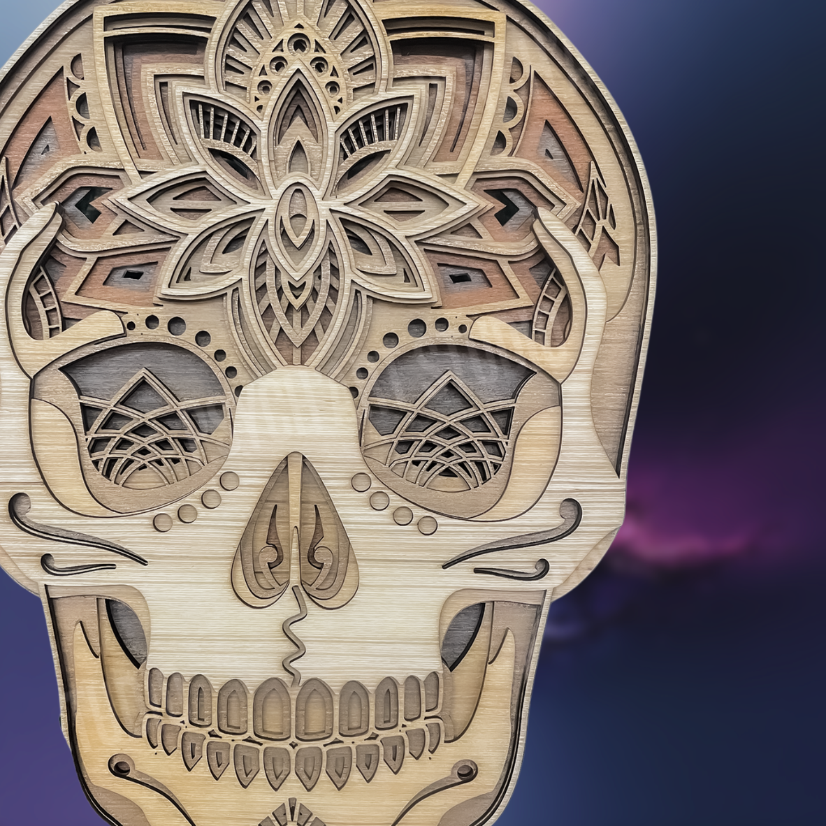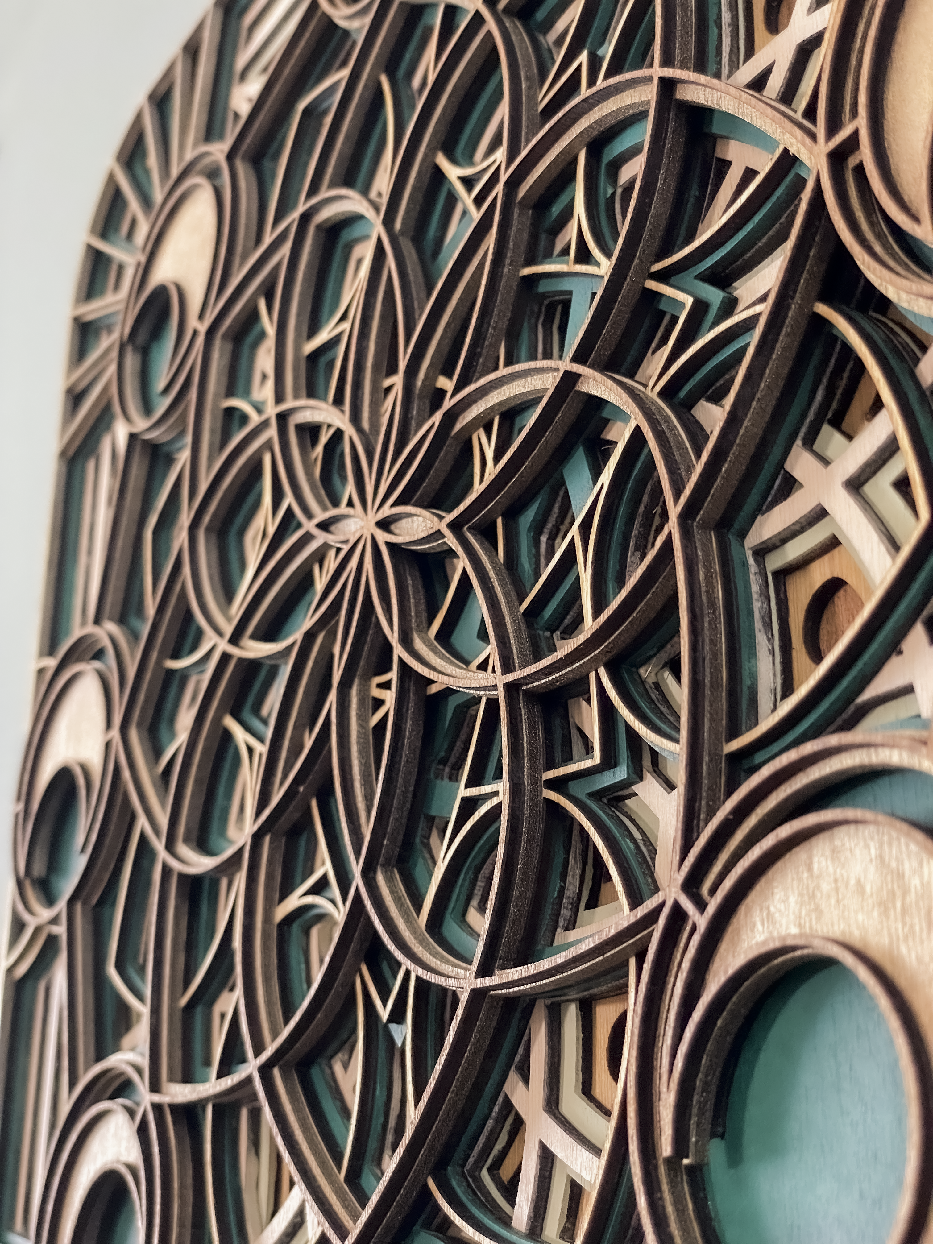 Je réalise des tableaux multicouches en peuplier ou bouleau, entièrement conçus par mes soins : du dessin sur Illustrator à la découpe laser, jusqu’au ponçage, au vernis et à l’assemblage final.